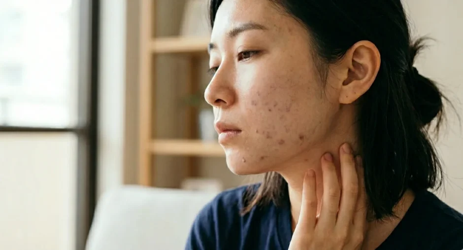 ニキビの炎症が落ち着いた後、皮膚に赤みが残ることがあります。これは炎症によって毛細血管が拡張し、血流の変化が皮膚の色に影響している状態です。時間が経てば自然に薄くなることもありますが、数カ月〜1年以上残るケースも少なくありません。